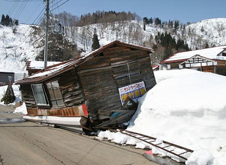 村道の両脇の住宅や物置などが倒壊 ▼平成23年3月13日